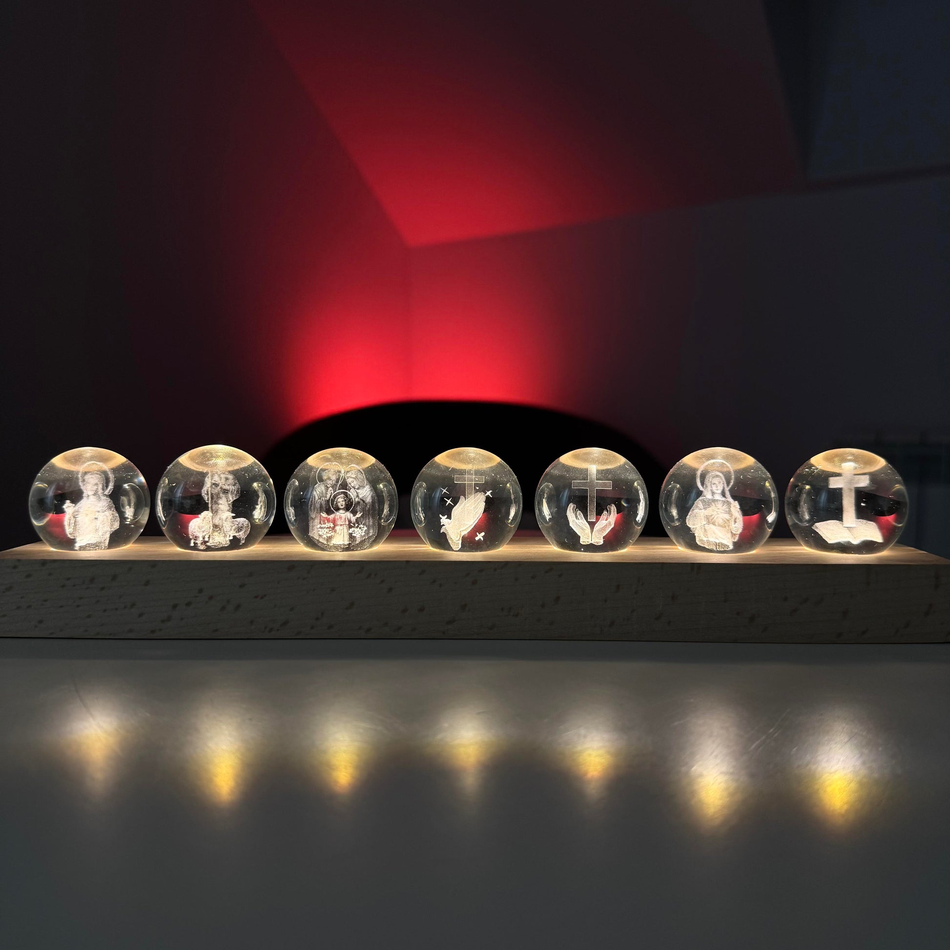 Each orb represents a pillar of the Christian journey—Jesus, Mary, prayer, family, salvation, faith, and Scripture. Together, they shine as a reminder of God’s eternal love.